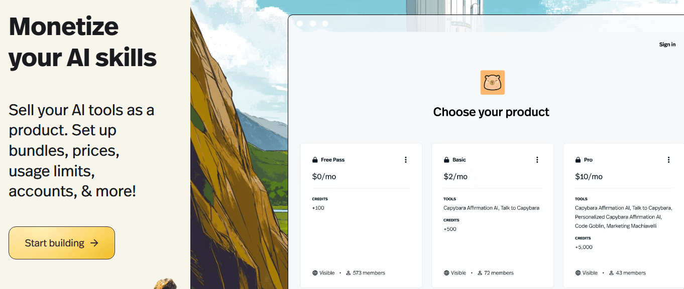 Sell your AI tools as a product. Set up bundles, prices, usage limits, accounts, & more!
